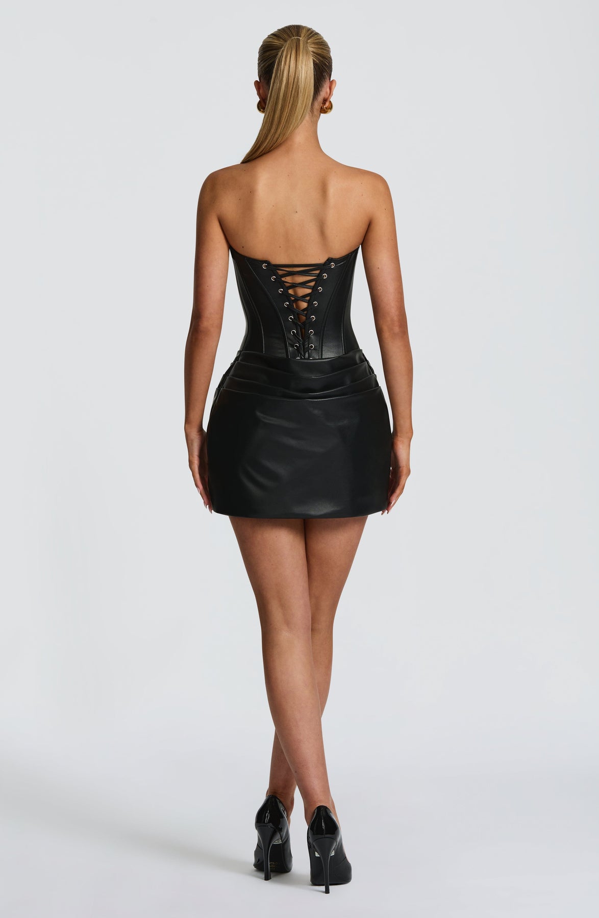 The Estelle Charming Mini Dress in deep burgundy captures timeless elegance with a modern twist. Crafted from soft faux leather, it features a flattering scooped neckline and a delicately draped cowl that adds a touch of allure. The structured bodice with supportive boning sculpts the waist, while the dropped silhouette flows into a cowled overlay skirt with deep side pleats — creating graceful movement and a sophisticated finish.