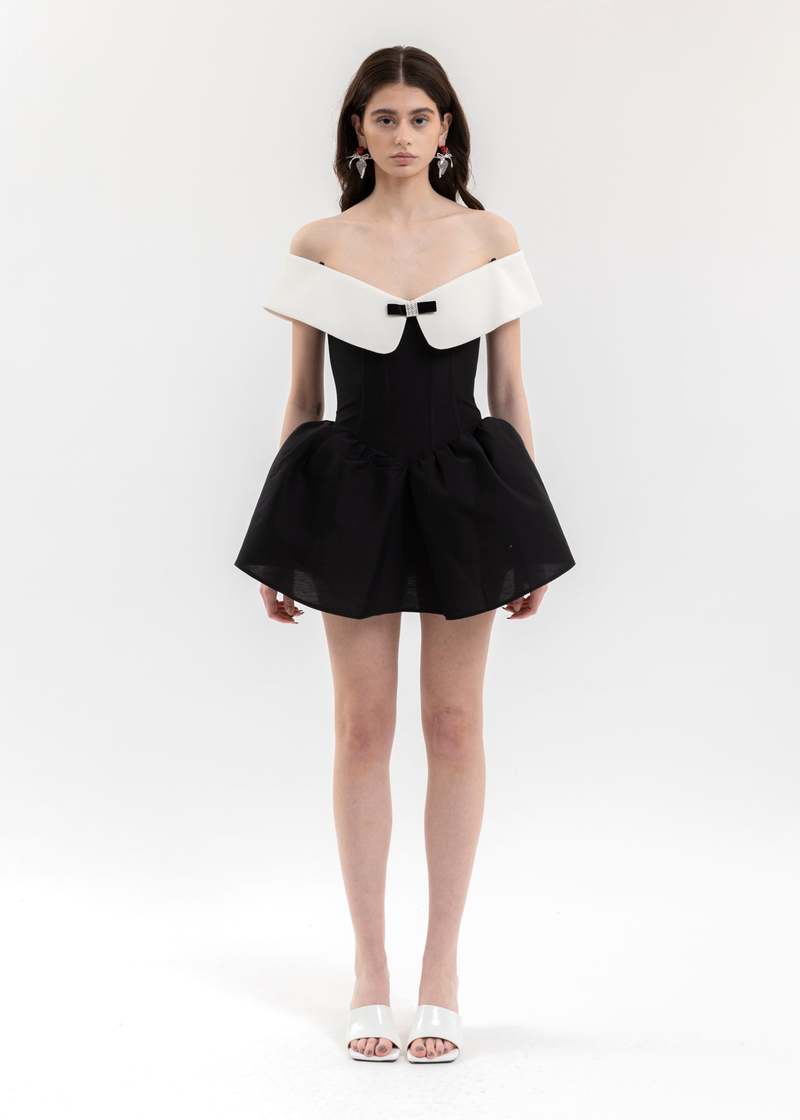 RUBY Off Shoulder Mini Dress is your flirty, feminine showpiece for every special night out. The dramatic off-shoulder neckline with crisp white collar and dainty bow detail frames your décolleté beautifully, while the structured bodice and voluminous mini skirt create the cutest hourglass, doll-like silhouette. Perfect for cocktail nights, birthdays, and any party where you want all eyes on you.